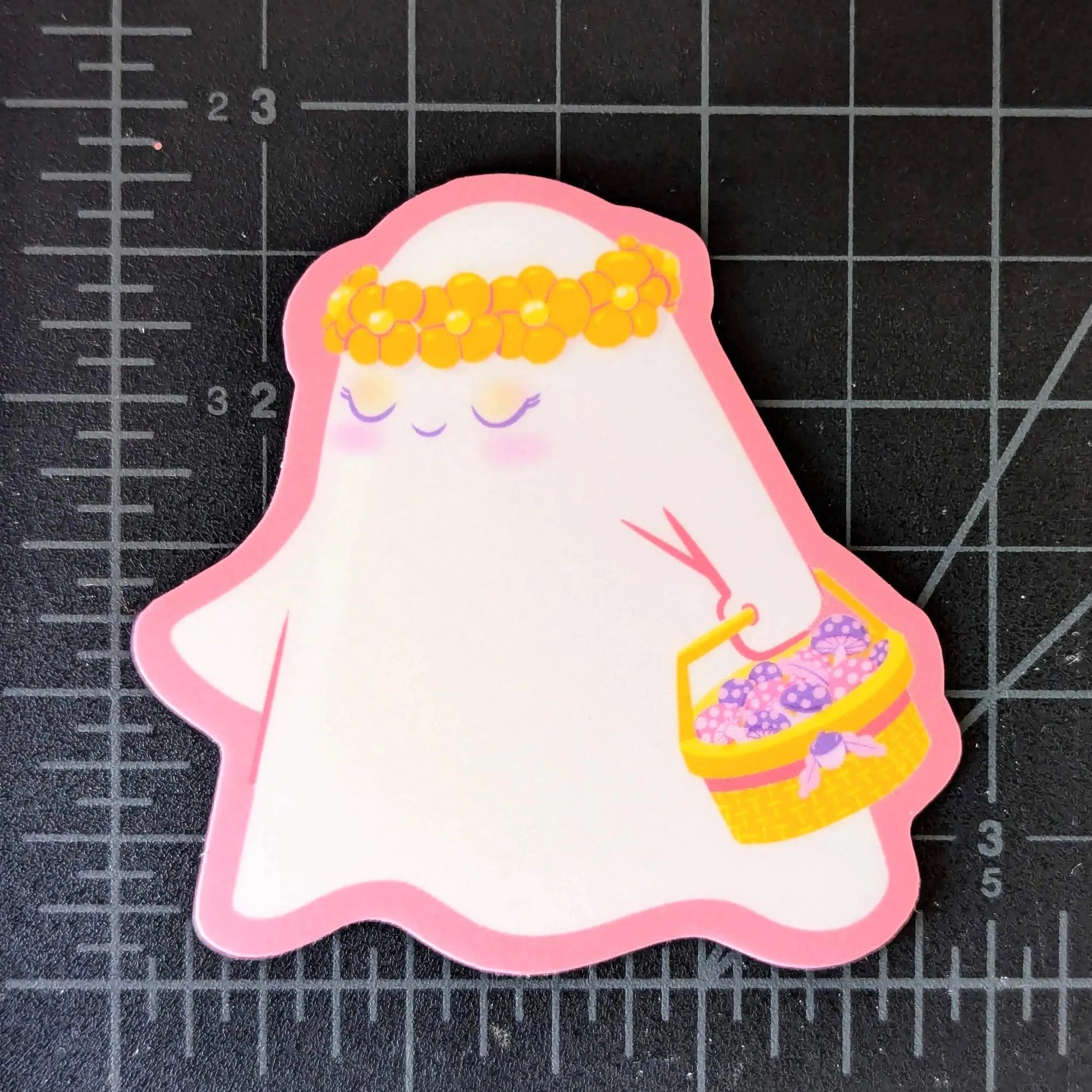 Meet the adorable hippy ghost on her whimsical mushroom-collecting adventure! Perfectly blending gothic and boho vibes, this sticker adds a fun, eclectic touch to your water bottle, laptop, or any flat surface. Embrace both the spooky and the cozy with this charming, durable sticker.