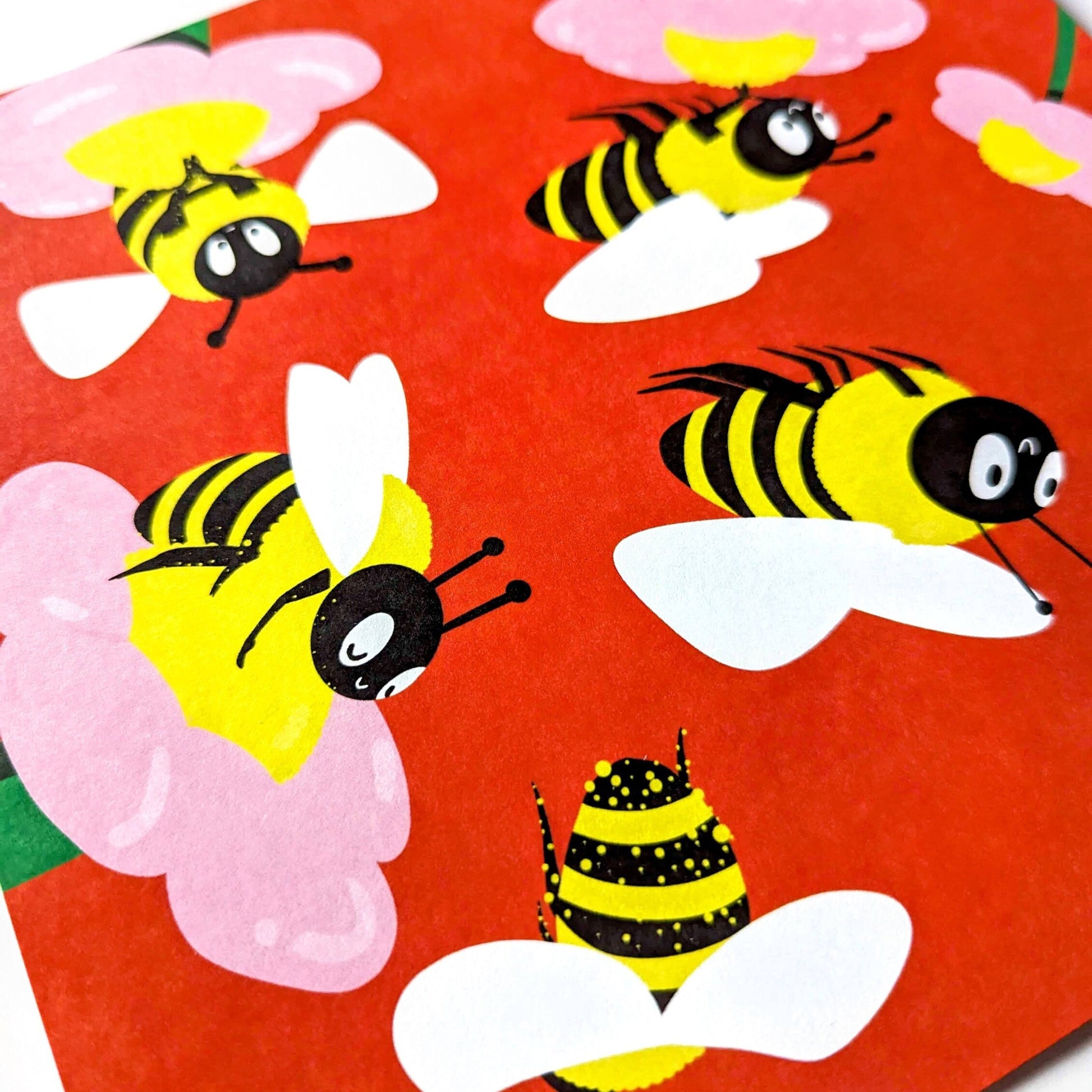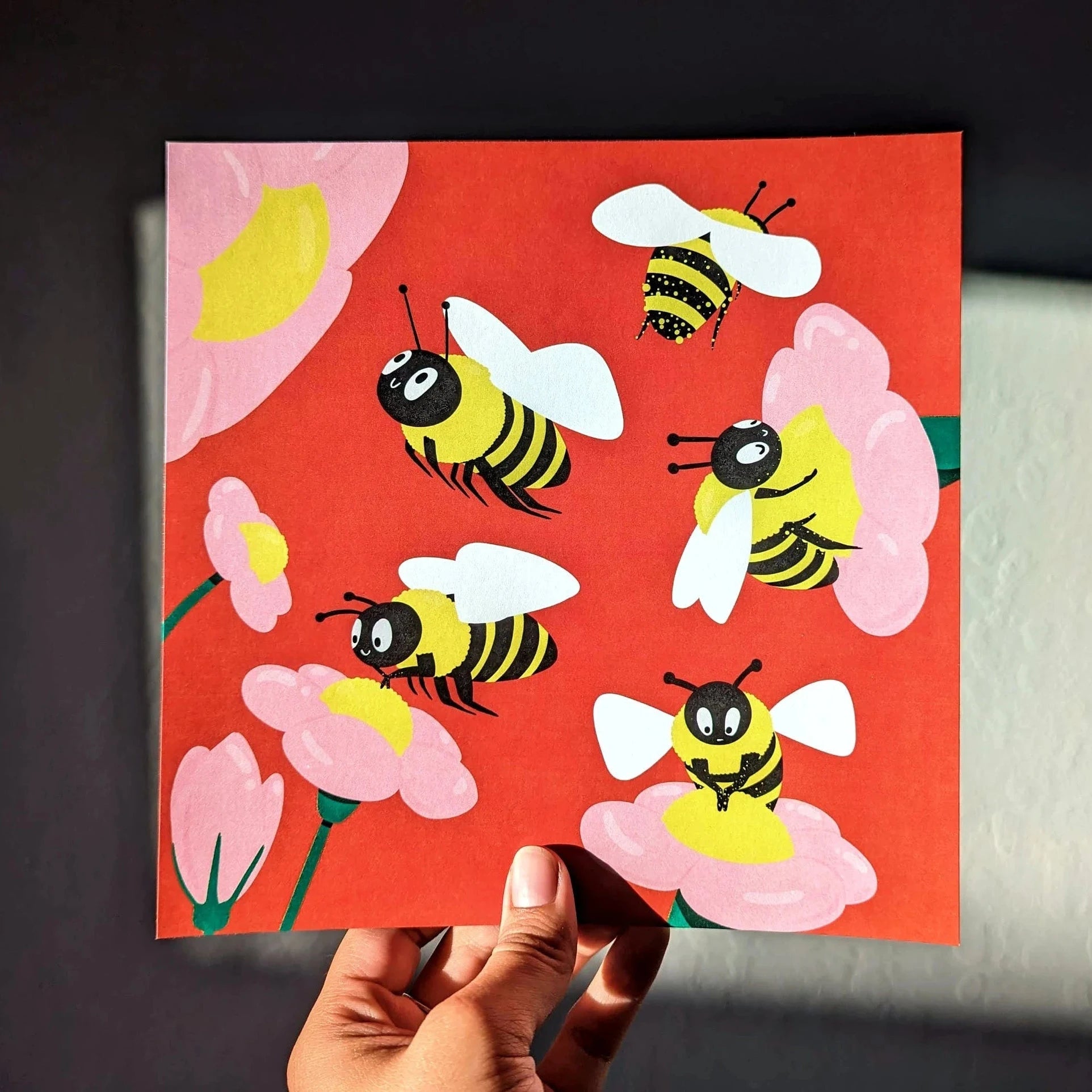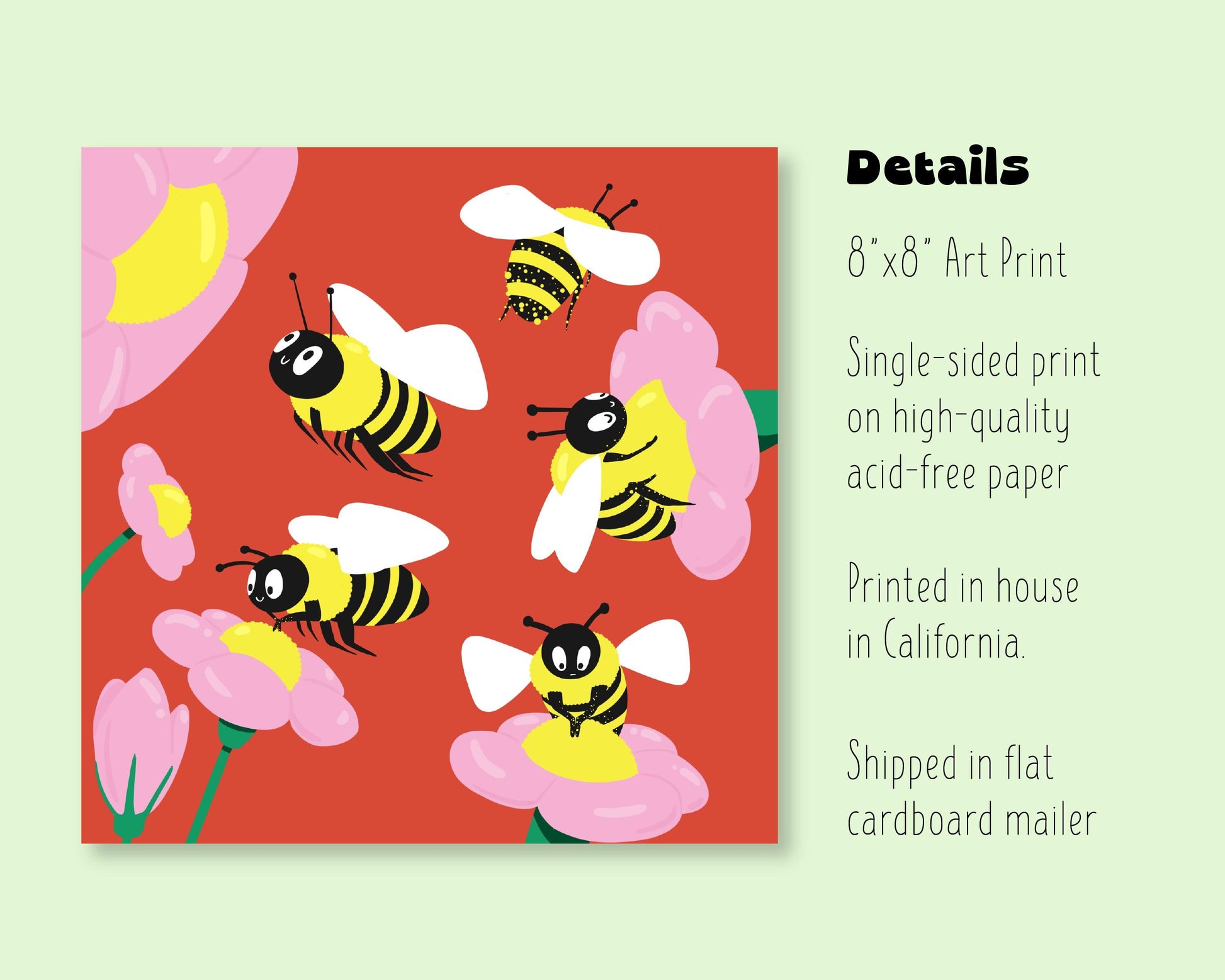 Buzz..buzz.buzz...A cute, charming and minimalistic illustration features a sweet colony of bees buzzing their way around a delicate pink flower garden. The bold colors and simple design make it a perfect addition to any bee nature lover’s home or office decor.