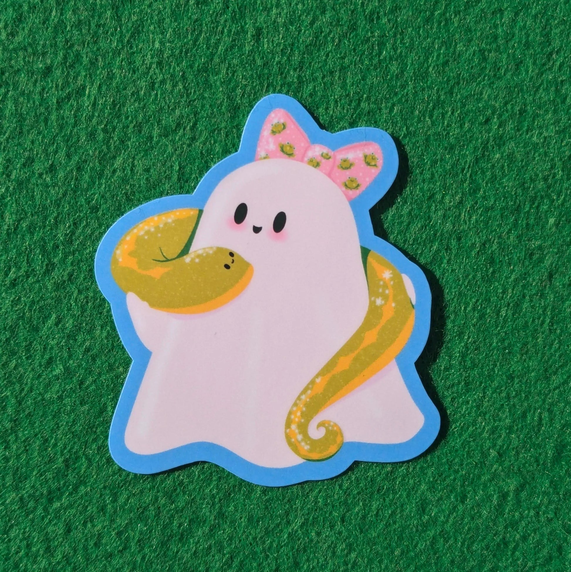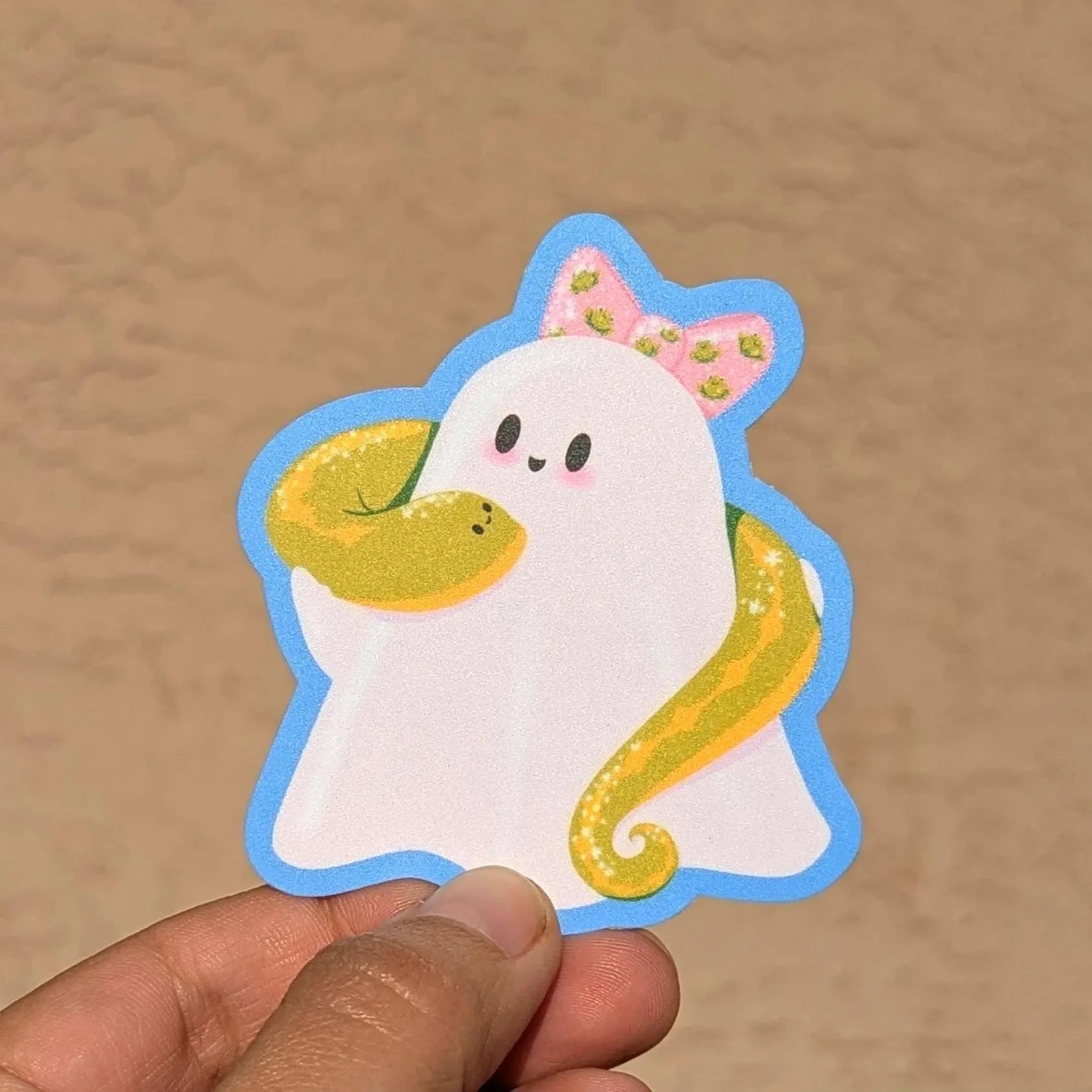 Adorable vinyl sticker featuring a cute ghost holding a snake, complete with a charming frog bow! Perfect for fans of cottagecore aesthetics, pastel goth vibes, or anyone looking to celebrate Halloween in style, this sticker is a versatile accessory for your water bottle, laptop, or any other surface you want to personalize.