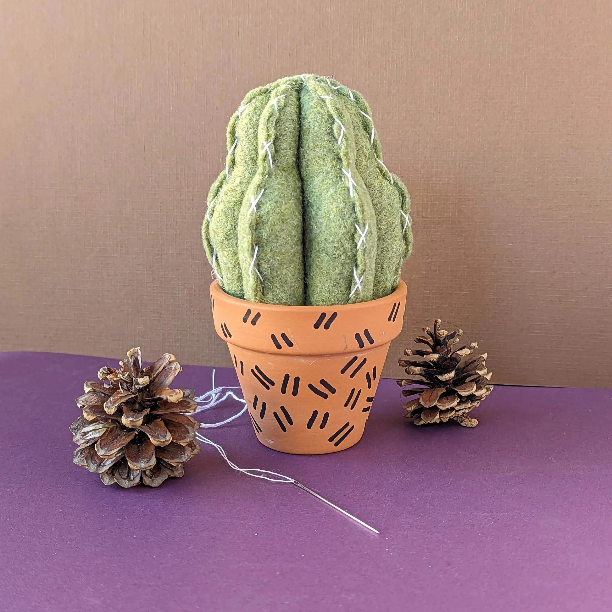 Add a touch of whimsy to your space with this handcrafted felt cactus. Each piece is meticulously sewn by hand and securely glued into a charming terracotta pot, creating a delightful and durable decor item.