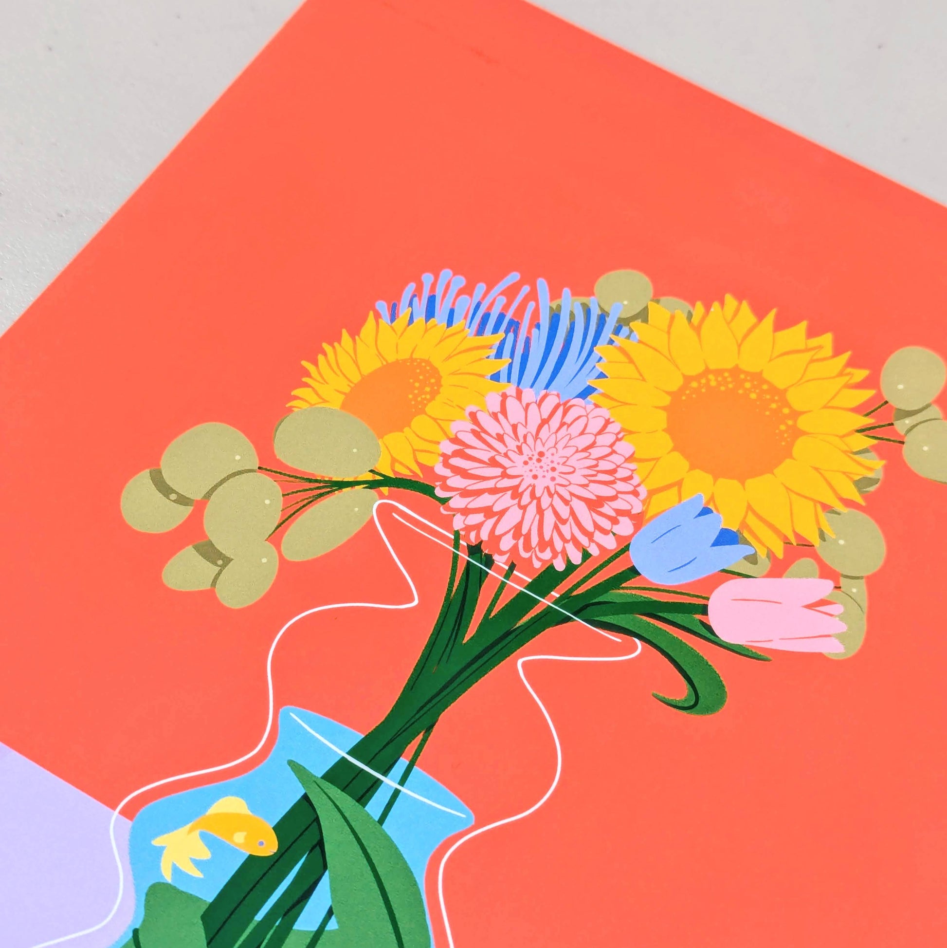 This bold art print features a floral bouquet with a unique twist—the vase doubles as a fish bowl. Its vibrant colors and striking design bring energy and charm to any room.