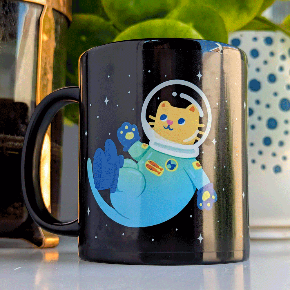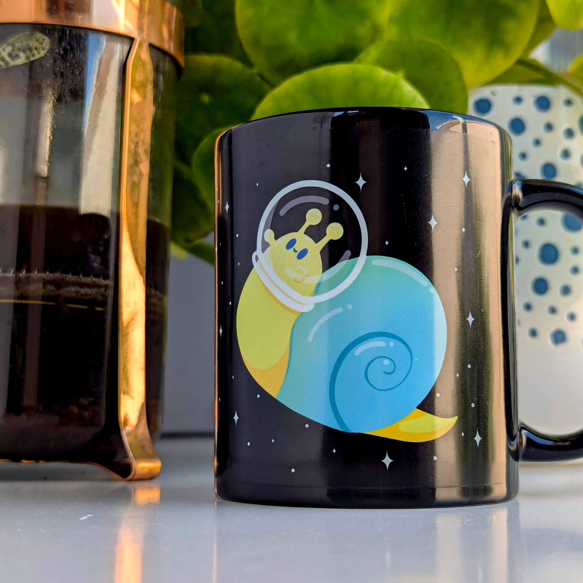 Having a cute spacey morning for your lovely cup of coffee. One side of this mug has a curious astronaut cat floating through space, while the other side features a cute little astronaut snail just enjoying the ride.