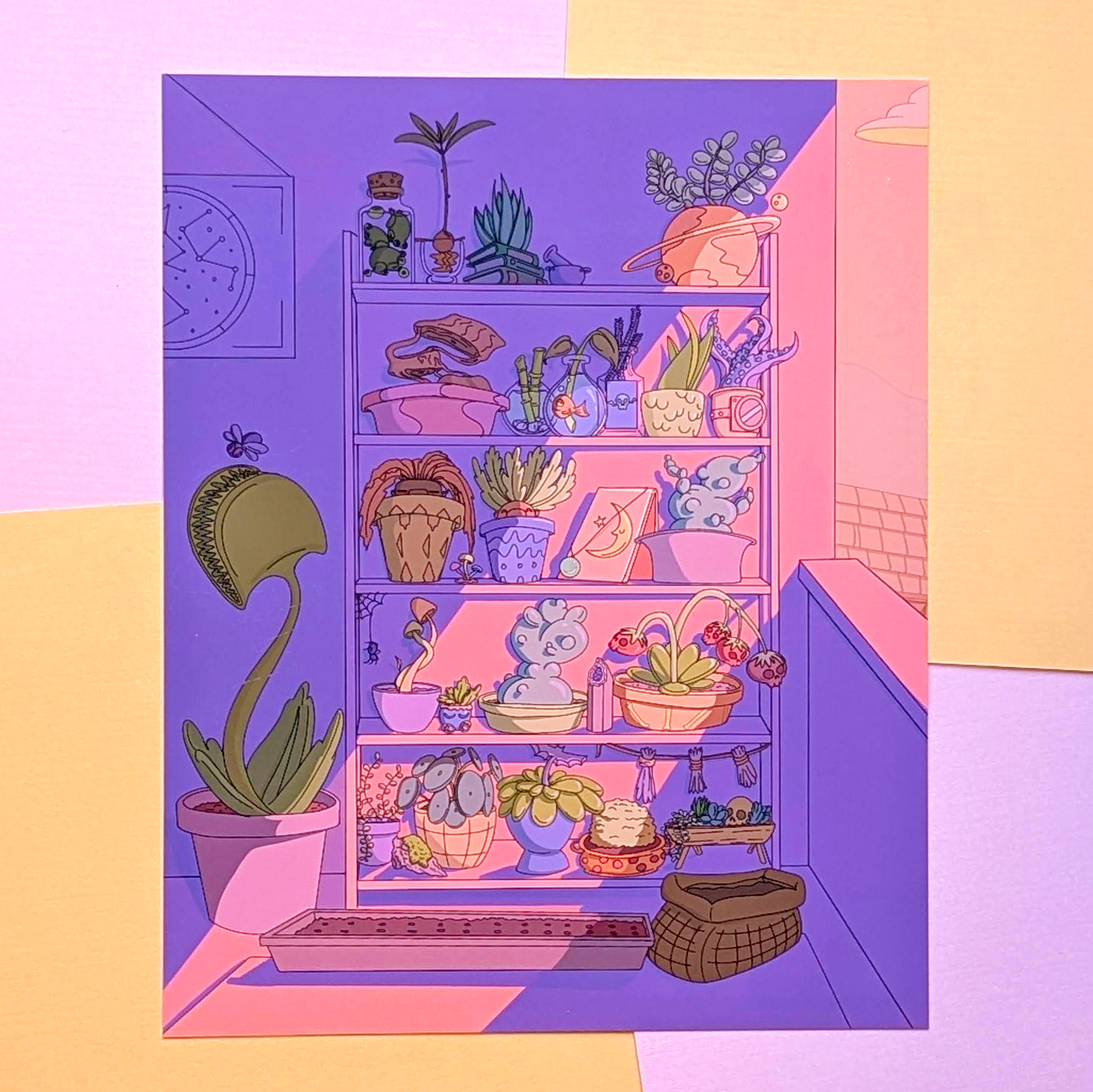 Transform your space with our enchanting Lofi Witch's Patio Garden art print! This whimsical 5x7 or 8x10 print captures the serene charm of a cozy garden, inviting you into a world of magic and tranquility. Perfect for adding a unique touch to your home decor, this piece is ideal for any witchy aesthetic lover or garden enthusiast. A beautiful illustration of a witch's balcony patio featuring some unique floral, plants and pots during sunset.